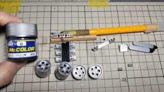 タミヤ ランボルギーニ カウンタック LP500S のプラモデル製作。今回はボディ以外のパーツの塗装とデカール貼りです。